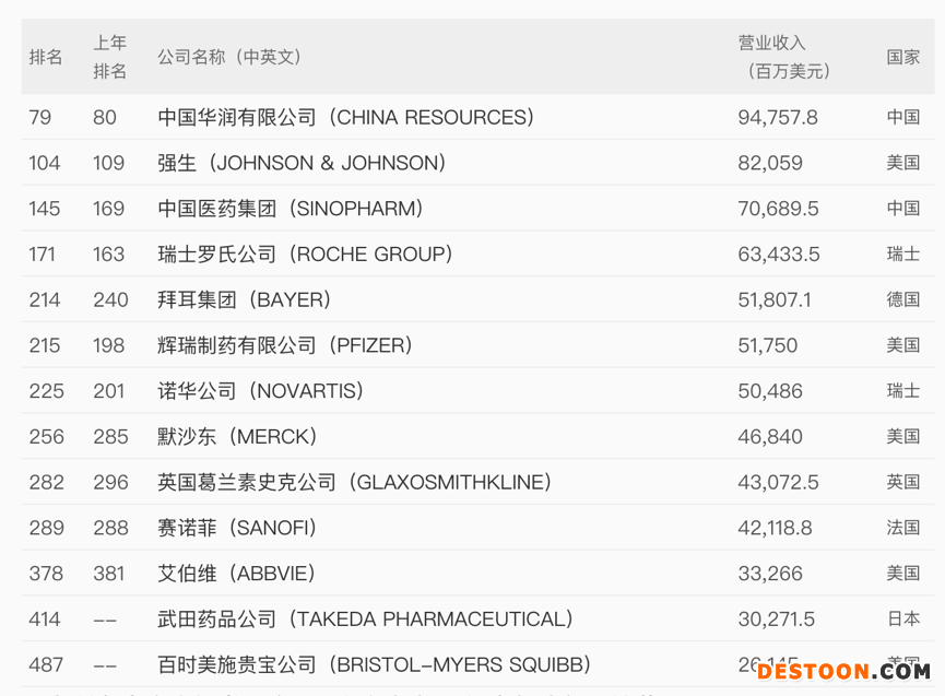 2020年《財(cái)富》世界500強(qiáng)中被歸為制藥領(lǐng)域的上榜企業(yè)