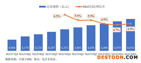 疫情下,社會藥房作為醫(yī)藥物資供給網(wǎng)點(diǎn)最多、可及性最強(qiáng)的窗口,作用更加凸顯。在防疫相關(guān)藥品、防護(hù)用品和消殺類產(chǎn)品的帶動下,MAT2020Q1零售藥店終端銷售規(guī)模為4616億元,同比增長 4.9%。