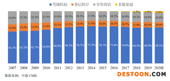 分渠道看,2019年,等級醫(yī)院市場占整個藥品市場的68.9%,零售藥店占整個藥品市場的18.8%。