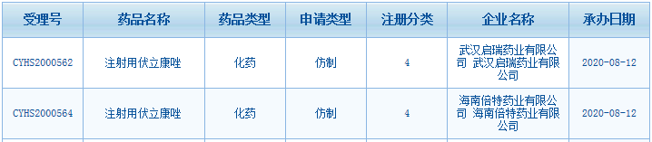 從承辦日期看,齊魯制藥于2018年7月首家以新分類提交注射用伏立康唑上市申請,海南普利制藥緊接其后。海南倍特藥業(yè)于2019年8月提交該產(chǎn)品上市申請,2020年8月12日再次提交,推測為新品規(guī)報產(chǎn)。