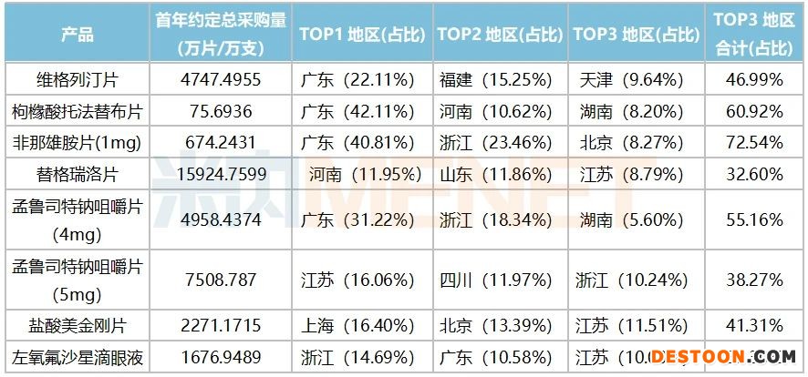 表4:七大產(chǎn)品首年約定采購量前三地區(qū)