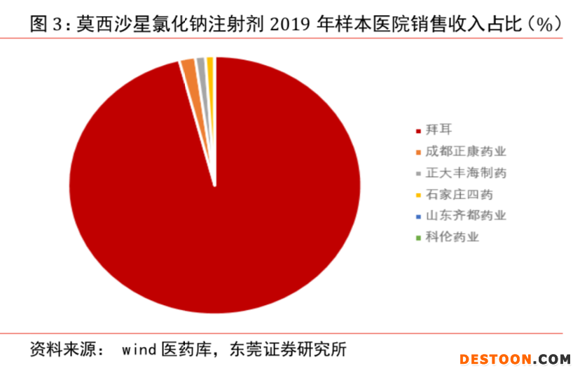 根據(jù)wind醫(yī)藥庫(kù)數(shù)據(jù),2019 年莫西沙星氯化鈉注射劑國(guó)內(nèi)樣本醫(yī)院銷售額為 9.13 億元,拜耳銷售收入占比約為 96.08%,天津紅日藥業(yè)和湖南愛科制藥均無銷售。根據(jù)最多入圍企業(yè)數(shù)規(guī)則,若這三家企業(yè)均申報(bào),將最多入圍 2 家。