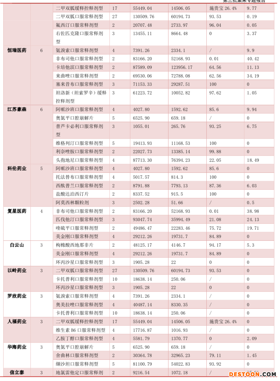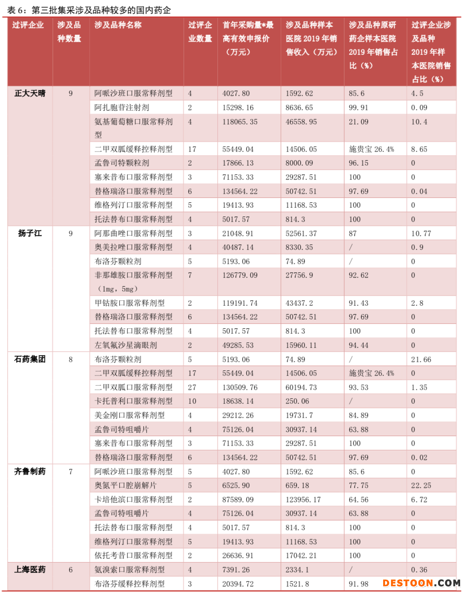 第三批集采品種中,國(guó)內(nèi)藥企正大天晴和揚(yáng)子江均涉及 9 個(gè)過評(píng)品種,石藥集團(tuán)涉及 8個(gè)品種,齊魯制藥涉及 7 個(gè)品種,上海醫(yī)藥、恒瑞醫(yī)藥、江蘇豪森均涉及6個(gè)品種,科倫藥業(yè)涉及 5 個(gè)品種, 復(fù)星醫(yī)藥涉及 4 個(gè)品種,白云山、以嶺藥業(yè)、羅欣藥業(yè)、人福藥業(yè)、華海藥業(yè)、信立泰、 海正藥業(yè)和康恩貝涉及 3 個(gè)品種。