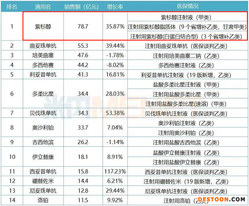 由于紫杉醇的細胞毒抗腫瘤原理,在很多腫瘤中治療過程中具有良好的化療效果,其適應(yīng)癥仍不斷拓展。就2019年公立醫(yī)療機構(gòu)終端數(shù)據(jù)來看,紫杉醇在抗腫瘤注射劑中表現(xiàn)突出,銷售額增長率達到35.87%。