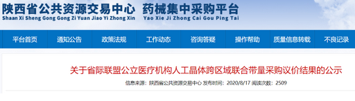 8月20日訊 8月17日,陜西省公共資源交易中心發(fā)布《關(guān)于省際聯(lián)盟公立醫(yī)療機(jī)構(gòu)人工晶體跨區(qū)域聯(lián)合帶量采購(gòu)議價(jià)結(jié)果的公示》。