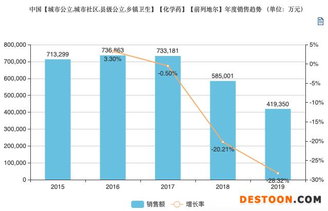 例如前列地爾,從2017年開(kāi)始市場(chǎng)就呈現(xiàn)逐年下滑趨勢(shì),從2018年負(fù)增長(zhǎng)越來(lái)越明顯。