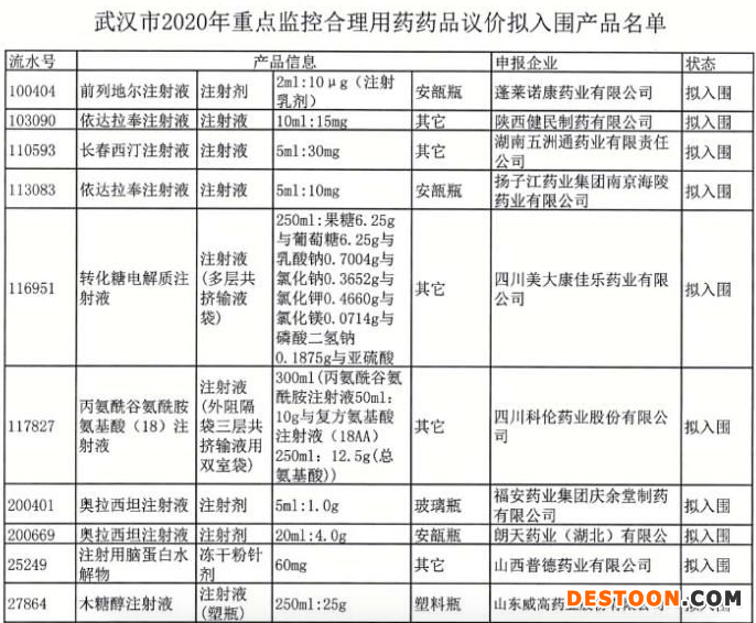 根據(jù)通知,武漢市2020年重點(diǎn)監(jiān)控合理用藥藥品議價(jià)報(bào)價(jià)工作已經(jīng)結(jié)束,現(xiàn)將企業(yè)和產(chǎn)品申報(bào)信息審核情況及擬入圍結(jié)果公示,公示時(shí)間為8月18日至8月24日。