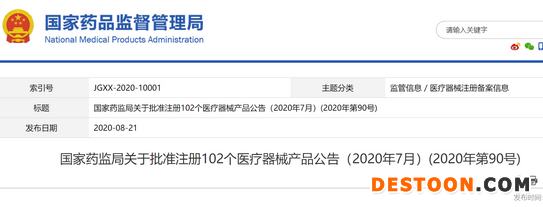 8月24日訊 8月21日,國(guó)家藥監(jiān)局發(fā)布《國(guó)家藥監(jiān)局關(guān)于批準(zhǔn)注冊(cè)102個(gè)醫(yī)療器械產(chǎn)品公告(2020年7月)(2020年第90號(hào))》。