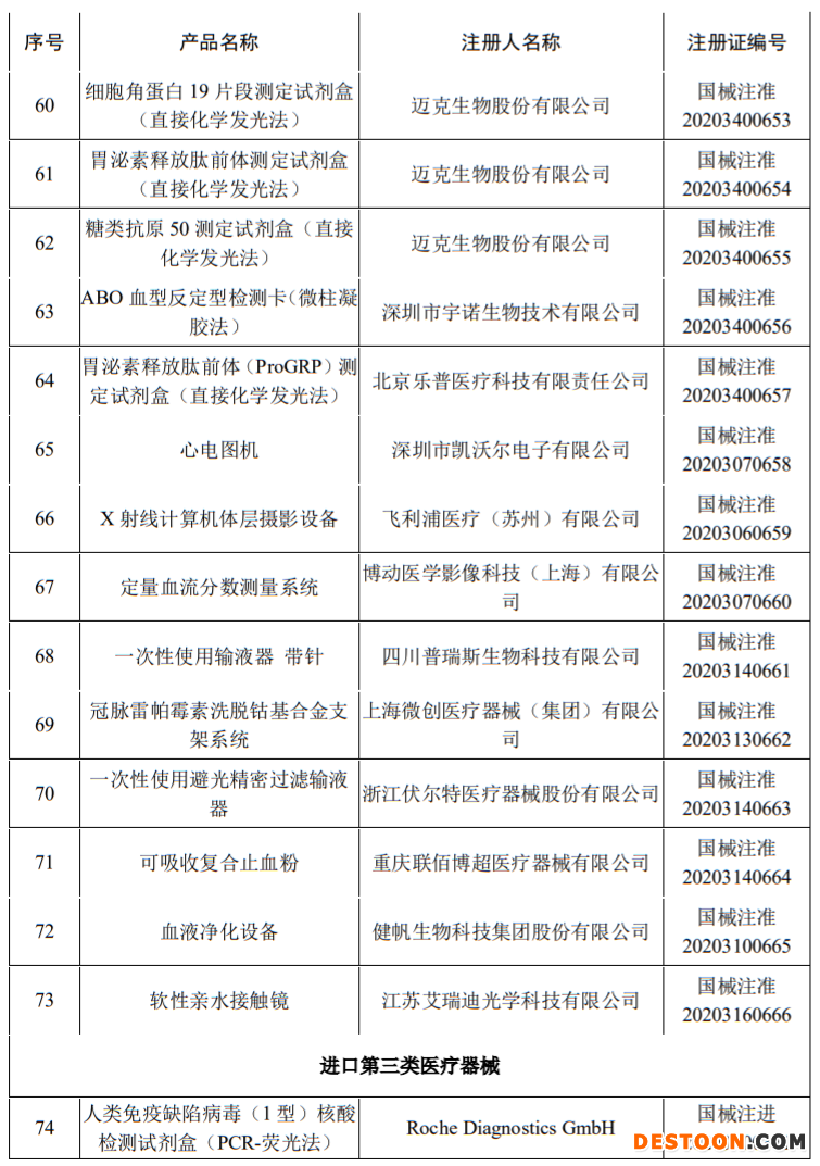 上述公告顯示,2020年7月,國(guó)家藥品監(jiān)督管理局共批準(zhǔn)注冊(cè)醫(yī)療器械產(chǎn)品102個(gè)。其中,境內(nèi)第三類醫(yī)療器械產(chǎn)品73個(gè),進(jìn)口第三類醫(yī)療器械產(chǎn)品11個(gè),進(jìn)口第二類醫(yī)療器械產(chǎn)品17個(gè),港澳臺(tái)醫(yī)療器械產(chǎn)品1個(gè)。