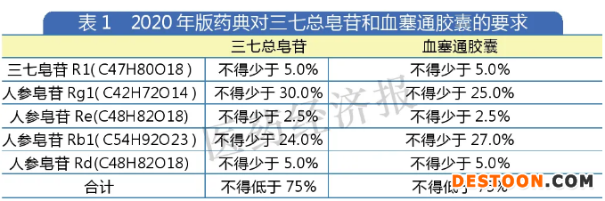 含量測定標(biāo)準(zhǔn)方面,2020年版藥典對三七總皂苷和血塞通膠囊的要求如表1。而若以“三七總皂苷”這種相對成分比較確定的中藥有效部位作為通用名,首先會遇到一種情況:總皂苷是皂苷類化合物的總稱,往往含有多個(gè)不同的成分,鑒于成分太多,指紋圖譜往往選擇最有代表性且有一定藥理作用的成分作為質(zhì)量控制的檢測物質(zhì),這意味著沒有列入質(zhì)量指標(biāo)的成分組合很大程度是不同的。