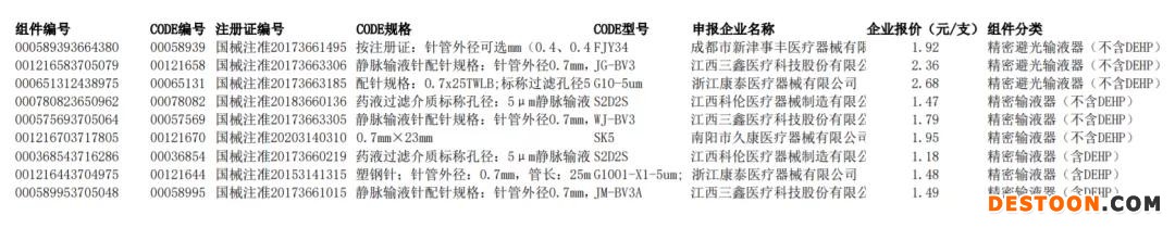 一次性使用精密輸液器擬中選企業(yè)包括成都市新津事豐醫(yī)療器械有限公司、江西三鑫醫(yī)療科技股份有限公司、浙江康泰醫(yī)療器械有限公司等,上述三家企業(yè)報(bào)價(jià)分別為1.92元、2.36元、2.68元。