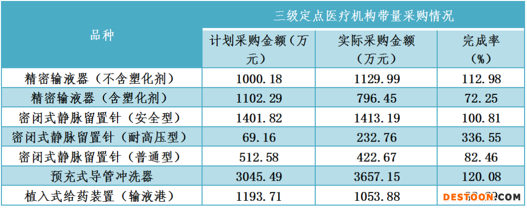聯(lián)盟帶量采購涉及密閉式靜脈留置針(普通型、安全型、耐高壓型)、精密輸液器(不含塑化劑、含塑化劑)、植入式給藥裝置(輸液港)、預(yù)充式導(dǎo)管沖洗器等4類7個(gè)品種,36家定點(diǎn)醫(yī)療機(jī)構(gòu)實(shí)際采購進(jìn)度較好,總的完成率達(dá)105.8%,超過預(yù)期。