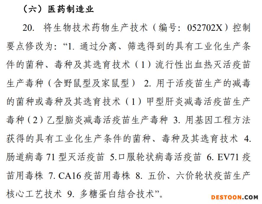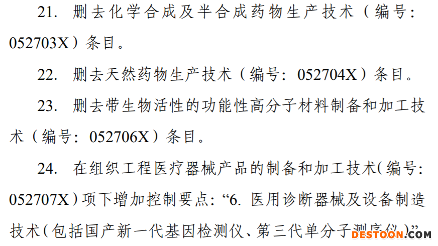 本次《目錄》共涉及53項(xiàng)技術(shù)條目:與醫(yī)藥制造業(yè)相關(guān)的禁止出口的技術(shù)條目3項(xiàng);限制出口的技術(shù)條目5項(xiàng)。