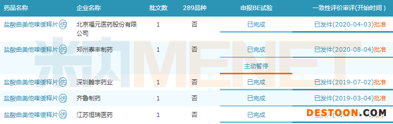米內(nèi)網(wǎng)一致性評(píng)價(jià)數(shù)據(jù)庫顯示,鹽酸曲美他嗪緩釋片過評(píng)企業(yè)有5家,分別為恒瑞醫(yī)藥、齊魯制藥、北京福元醫(yī)藥/翰宇藥業(yè)、鄭州泰豐制藥。北京百美特生物的鹽酸曲美他嗪緩釋片注冊辦理狀態(tài)已變更為“在審批”,若順利獲批將視同過評(píng),成為該品種第6家過評(píng)企業(yè)。