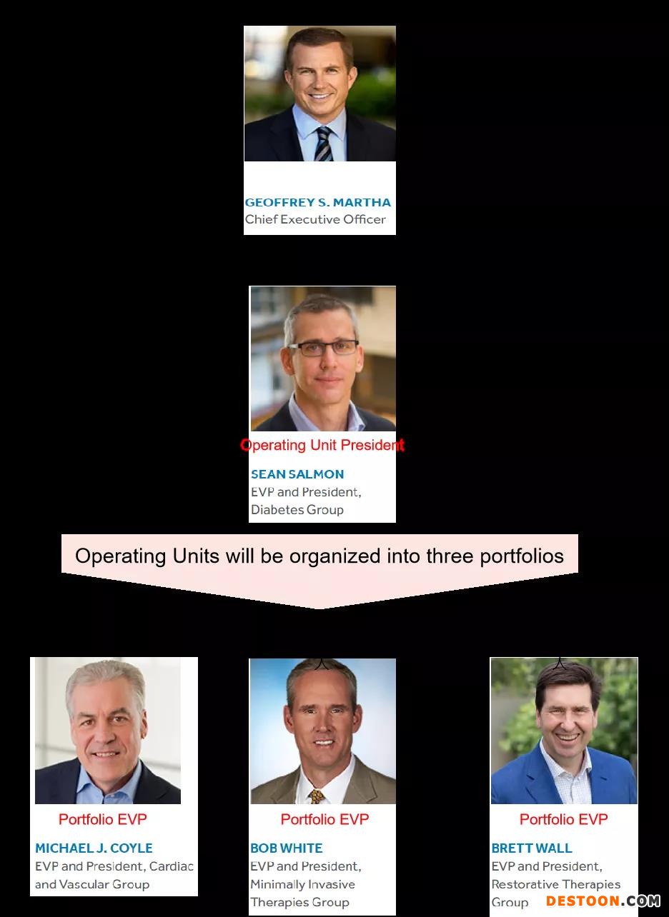 運營部門“Operating Units”將被分成三個子部門(Three Portfolios),由Mike Coyle(現(xiàn)心血管全球負責人), Brett Wall(現(xiàn)恢復性療法全球負責人), 以及Bob White(現(xiàn)微創(chuàng)外科全球負責人)擔任Portfolio Executive Vice President。