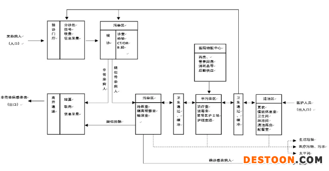 2.5 發(fā)熱門(mén)診應(yīng)當(dāng)合理設(shè)置清潔通道、污染通道,設(shè)置患者專(zhuān)用出入口和醫(yī)務(wù)人員專(zhuān)用通道,合理組織清潔物品和污染物品流線(xiàn),有效控制院內(nèi)交叉感染。各出入口、通道應(yīng)當(dāng)設(shè)有醒目標(biāo)識(shí),避免誤入。