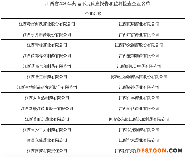 根據(jù)通知要求,江西省藥監(jiān)局將組織檢查人員對以下名單內(nèi)企業(yè)開展不良反應(yīng)報(bào)告和監(jiān)測現(xiàn)場專項(xiàng)檢查,一共33家藥企,檢查時(shí)間為9月下旬。