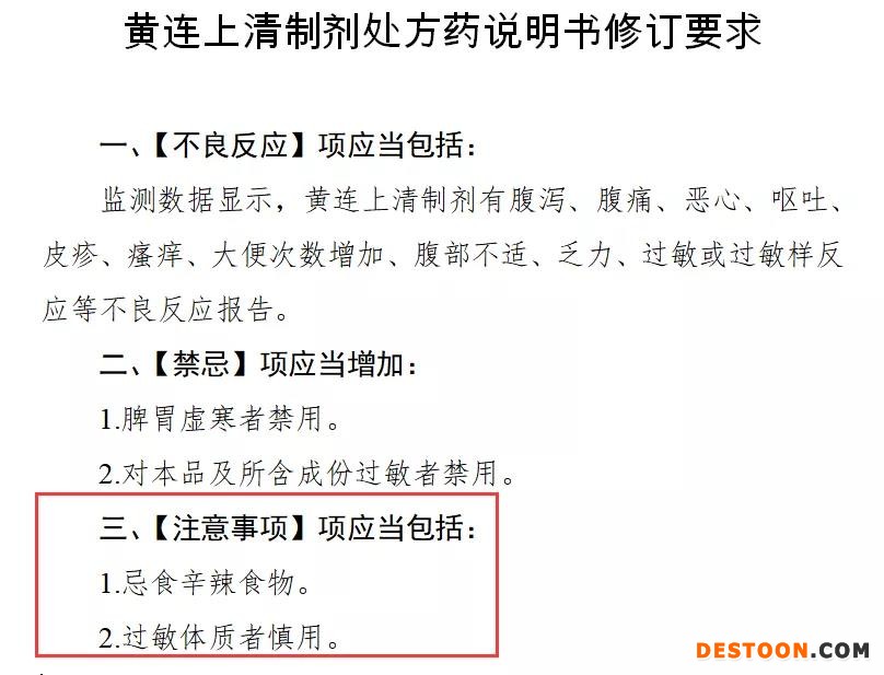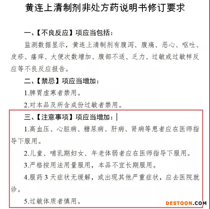 《公告》指出,根據藥品不良反應評估結果,為進一步保障公眾用藥安全,國家藥監(jiān)局決定對黃連上清制劑(包括丸劑、片劑、顆粒劑、膠囊劑)說明書【不良反應】【禁忌】和【注意事項】項進行統(tǒng)一修訂。