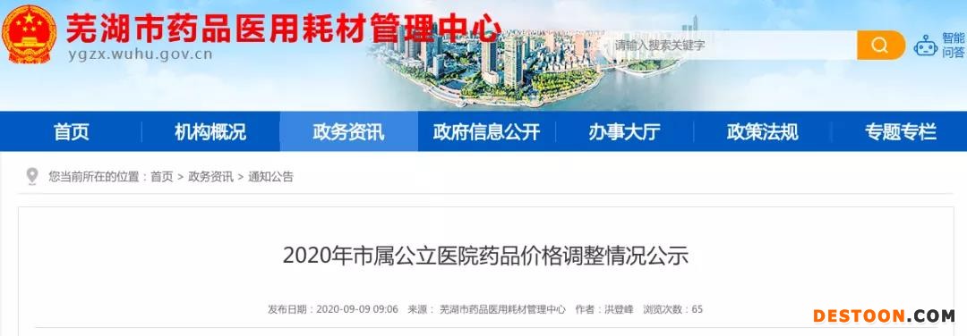 9月11日訊 9月9日,安徽省蕪湖市藥品醫(yī)用耗材管理中心發(fā)布《2020年市屬公立醫(yī)院藥品價(jià)格調(diào)整情況公示》。