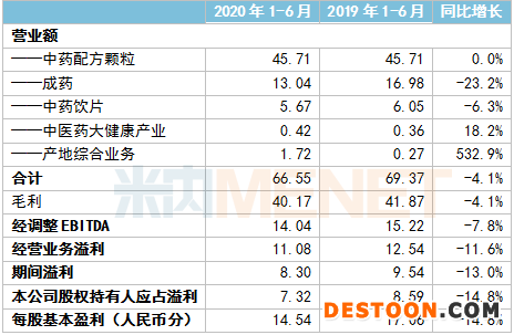 上半年,中國(guó)中藥實(shí)現(xiàn)營(yíng)業(yè)收入66.55億元,同比下降4.1%。其中,中藥配方顆粒業(yè)務(wù)營(yíng)業(yè)收入45.70億元,占總收入68.7%;中成藥業(yè)務(wù)營(yíng)業(yè)收入13.04億元,占總收入19.6%;中藥飲片業(yè)務(wù)營(yíng)業(yè)收入5.67億元,占總收入8.5%;中醫(yī)藥大健康業(yè)務(wù)營(yíng)業(yè)收入0.42億元,占總收入0.6%;產(chǎn)地綜合業(yè)務(wù)營(yíng)業(yè)收入1.72億元,占總收入2.6%。