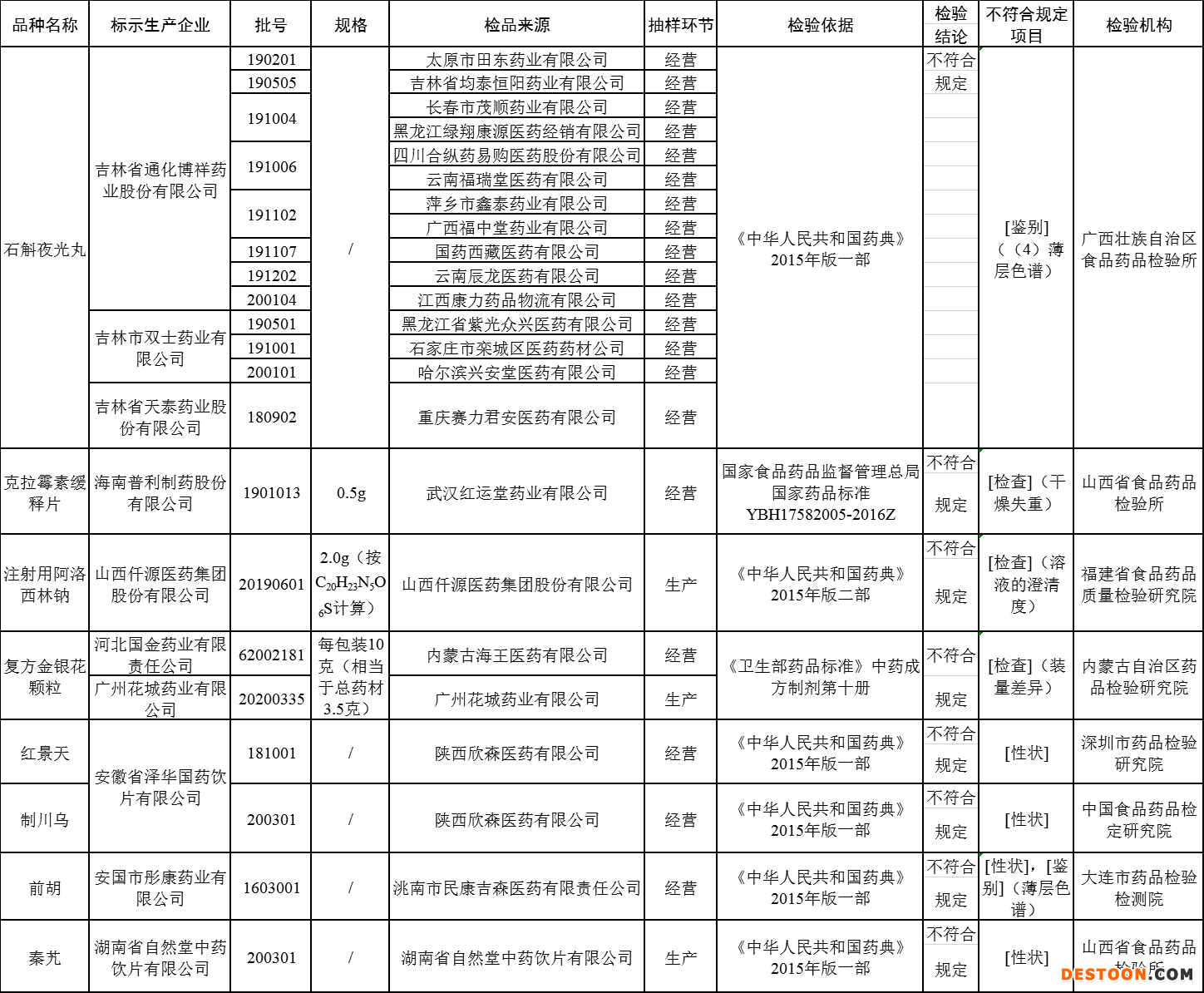 一、經(jīng)廣西壯族自治區(qū)食品藥品檢驗所檢驗,標示為吉林省通化博祥藥業(yè)股份有限公司、吉林市雙士藥業(yè)有限公司、吉林省天泰藥業(yè)股份有限公生產(chǎn)的12批次石斛夜光丸不符合規(guī)定,不符合規(guī)定項目為鑒別。
