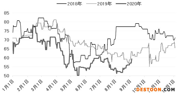 8月末,美國(guó)多套乙二醇裝置受颶風(fēng)影響延長(zhǎng)停車(chē)時(shí)間,國(guó)內(nèi)乙二醇進(jìn)口有所下降;歐美地區(qū)乙二醇套利窗口的打開(kāi),也吸引了一部分乙二醇流向歐美市場(chǎng),國(guó)內(nèi)乙二醇港口庫(kù)存在8月連續(xù)去庫(kù)。盡管如此,乙二醇華東港口庫(kù)存仍然處于140萬(wàn)噸附近高位,并且歐美市場(chǎng)的乙二醇需求總量有限,因此套利窗口開(kāi)啟時(shí)間較短,國(guó)內(nèi)乙二醇高企的庫(kù)存壓力短時(shí)間內(nèi)難有明顯緩解。截至9月7日,華東港口乙二醇庫(kù)存為140萬(wàn)噸,較2019年同期大幅增加60.37萬(wàn)噸。