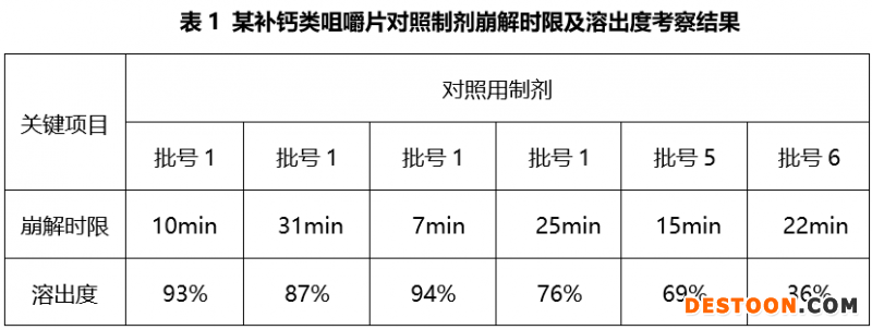 如對(duì)于《目錄》中的咀嚼片類品種,中國(guó)藥典通則中未對(duì)其崩解時(shí)限及溶出曲線作硬性規(guī)定,且各國(guó)藥典收載標(biāo)準(zhǔn)亦未將溶出度列入其質(zhì)量標(biāo)準(zhǔn)。某補(bǔ)鈣類咀嚼片,研究人員對(duì)主流國(guó)家上市的不同批次對(duì)照制劑進(jìn)行崩解時(shí)限及溶出度考察,結(jié)果表明崩解時(shí)限和溶出度的批間差異較大,六批對(duì)照制劑的崩解時(shí)限在7~30min不等,在鹽酸介質(zhì)中30min溶出度在36%~97%不等,相關(guān)數(shù)據(jù)見表1。
