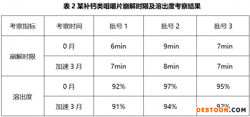 為有效的控制自制品的批間均一性及貨架期間穩(wěn)定性,為生產(chǎn)參數(shù)的制定提供依據(jù),同時(shí)保證咀嚼片在臨床使用期間由于部分人群咀嚼不完全導(dǎo)致臨床療效的差異,故推薦按照普通速釋片的崩解時(shí)限及溶出度標(biāo)準(zhǔn)確定咀嚼片的控制標(biāo)準(zhǔn)。參考USP<2040>相關(guān)規(guī)定將某補(bǔ)鈣類咀嚼片內(nèi)控崩解時(shí)限擬定為不得過30min,參考USP同品種普通速釋片劑將在鹽酸介質(zhì)中30min的溶出度擬定為不得過75%。對(duì)多批次自制品進(jìn)行考察,結(jié)果見表2。