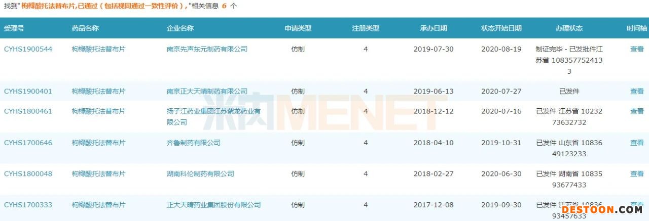 枸櫞酸托法替布是全球首個(gè)治療類風(fēng)濕關(guān)節(jié)炎的小分子靶向JAK激酶抑制劑。米內(nèi)網(wǎng)數(shù)據(jù)顯示,2019年輝瑞托法替布全球銷售額超過20億美元;在中國(guó)公立醫(yī)療機(jī)構(gòu)終端枸櫞酸托法替布片銷售額雖然不足5000萬元,但同比增長(zhǎng)卻超過400%。輝瑞的枸櫞酸托法替布于2017年獲批進(jìn)入中國(guó)市場(chǎng);2019年9月,正大天晴藥業(yè)集團(tuán)的枸櫞酸托法替布片以仿制4類首仿獲批。截至目前,擁有枸櫞酸托法替布片的國(guó)產(chǎn)批文廠家有正大天晴藥業(yè)集團(tuán)、齊魯制藥、湖南科倫制藥、揚(yáng)子江藥業(yè)集團(tuán)江蘇紫龍藥業(yè)等6家。