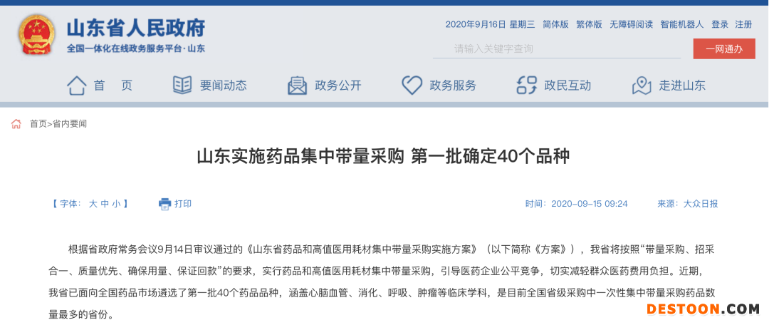 9月17日訊 9月15日,根據(jù)山東政府網(wǎng)消息,該省常務(wù)會(huì)議日前審議通過《山東省藥品和高值醫(yī)用耗材集中帶量采購(gòu)實(shí)施方案》,意味著山東醞釀已久的藥品集中帶量采購(gòu)將正式落地。