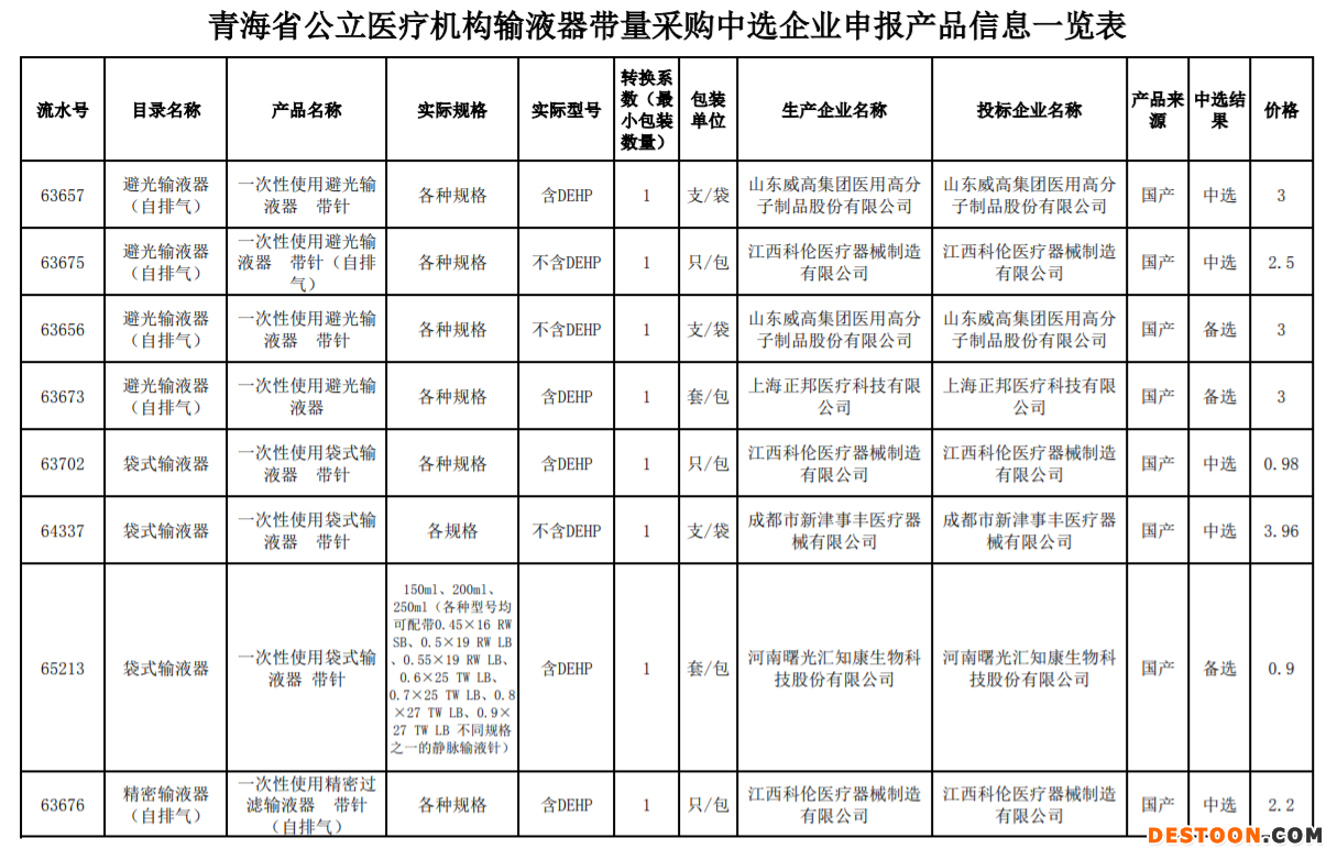 9月18日訊 9月15日,青海省藥品和醫(yī)用耗材集中采購(gòu)網(wǎng)發(fā)布《關(guān)于公布青海省公立醫(yī)療機(jī)構(gòu)醫(yī)用耗材帶量采購(gòu)中選企業(yè)申報(bào)產(chǎn)品信息的通知》,將留置針、輸液器帶量采購(gòu)中選企業(yè)申報(bào)產(chǎn)品信息進(jìn)行公布。