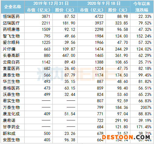 9月21日訊 日前,千億市值的“醫(yī)藥茅臺(tái)”長(zhǎng)春高新股價(jià)突然跌停,4天市值蒸發(fā)超200億;康美藥業(yè)獲國(guó)資接盤,復(fù)牌后9連板漲停再現(xiàn)“天地板”,昔日千億市值僅剩200億;千山藥機(jī)被深交所摘牌,跌幅創(chuàng)A股紀(jì)錄,暴跌99.75%,資料顯示,千山藥機(jī)有近5萬(wàn)戶股東,近年來公司深陷年報(bào)造假、占用資金風(fēng)波,近三年凈利潤(rùn)虧損合計(jì)超過35億元,而今在資本市場(chǎng)最終以退市收?qǐng)?。目前,A股市場(chǎng)上,恒瑞醫(yī)藥、邁瑞醫(yī)療、藥明康德、智飛生物、片仔癀等10只醫(yī)藥股市值均超千億規(guī)模。截至9月18日收盤,恒瑞醫(yī)藥仍以4722億元市值居于首位,邁瑞醫(yī)療緊跟其后;此外,片仔癀市值超越云南白藥,成為了中藥板塊市值龍頭。