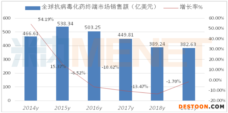 抗丙肝病毒藥物Sovaldi于2014年獨(dú)占鰲頭拿下百億美金市場,2019年已有14個(gè)抗丙肝病毒藥物在市場上競爭,Sovaldi已成昨日黃花。2019年,全球抗丙肝病毒藥物總體市場相比峰值年下滑75%的形勢下,給全球抗病毒市場下滑做出了圓滿的詮釋。而抗流感病毒和抗HIV市場增長仍在提速。2019年全球抗流感病毒化藥市場銷售額14.93億美元,同比上一年增長了62.81%,達(dá)到了近五年的峰值。在新冠疫情的漫延下,2020年將呈現(xiàn)出持續(xù)增長的可能性,主要品種是奧司他韋、辛酸拉尼米韋、扎那米韋、阿比多爾、利巴韋林。
