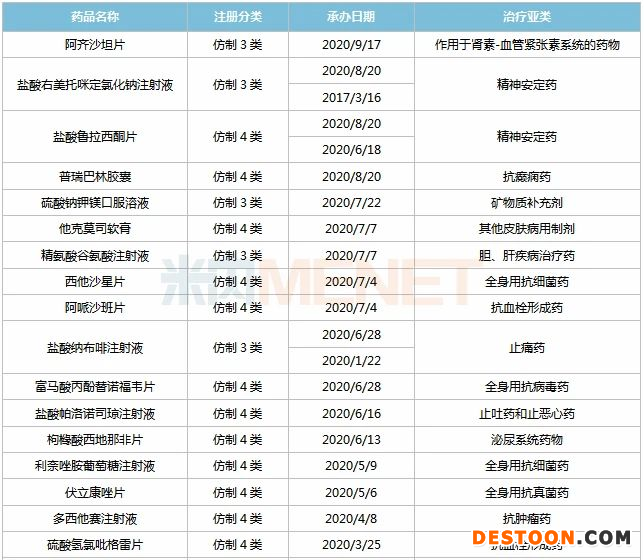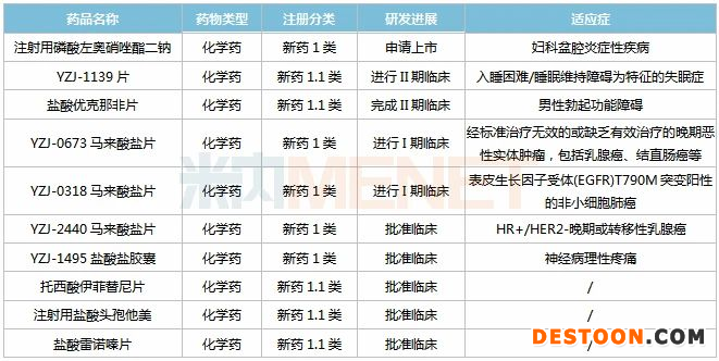 托西酸伊菲替尼片屬于替尼類小分子藥物,為特殊審評品種,注射用鹽酸頭孢他美為重大專項及特殊審評品種,YZJ-2440馬來酸鹽片、YZJ-1495鹽酸鹽膠囊均為2020年獲批臨床的新藥,作用靶點暫時未知。