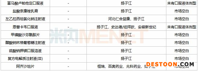 11個品種由揚子江首家或獨家以新分類報產(chǎn),獲得首仿的幾率比較大。其中氫溴酸伏硫西汀片、鹽酸右美托咪定氯化鈉注射液、恩替卡韋口服液3個品種由揚子江首家以新分類報產(chǎn);注射用磷酸特地唑胺、鹽酸達(dá)拉他韋片、富馬酸盧帕他定口服液、鹽酸奈康唑乳膏、甲磺酸沙芬酰胺片、復(fù)方電解質(zhì)注射液(Ⅲ)、醋酸鈉林格葡萄糖注射液、硫酸鈉鉀鎂口服溶液8個品種由揚子江獨家以新分類報產(chǎn)。