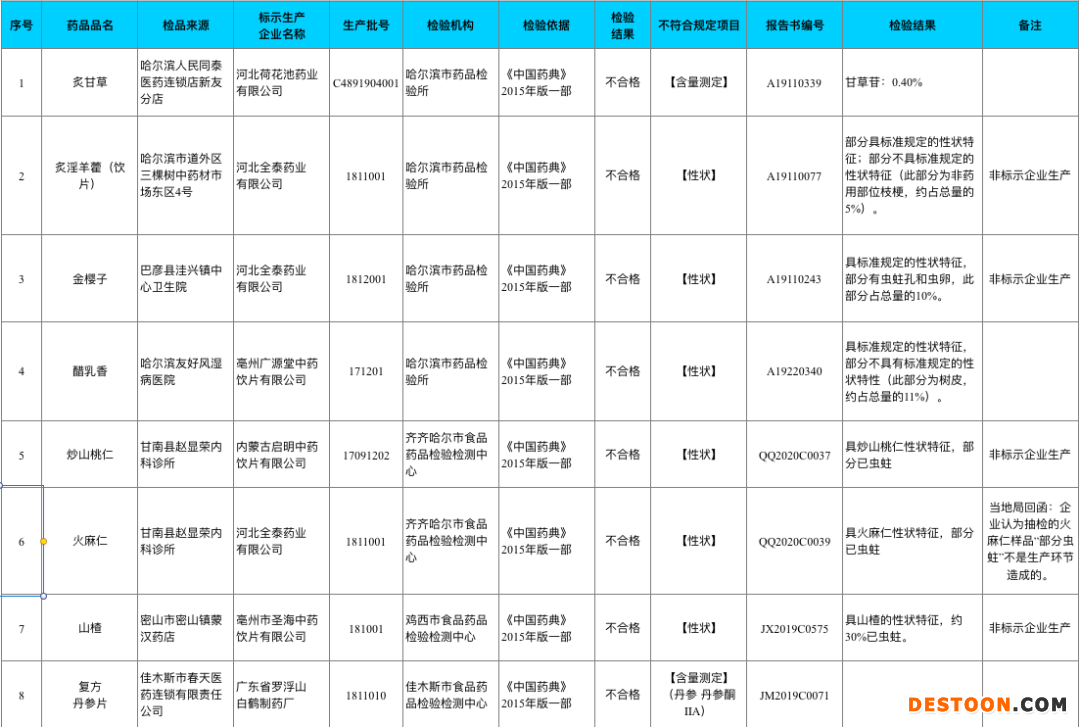 根據(jù)《公告》,抽檢中發(fā)現(xiàn)的8批次不符合規(guī)定藥品,其中7個(gè)為中藥飲片:炙甘草、炙淫羊藿(飲片)、金櫻子、醋乳香、炒山桃仁、火麻仁、山楂;1個(gè)中成藥:復(fù)方丹參片。