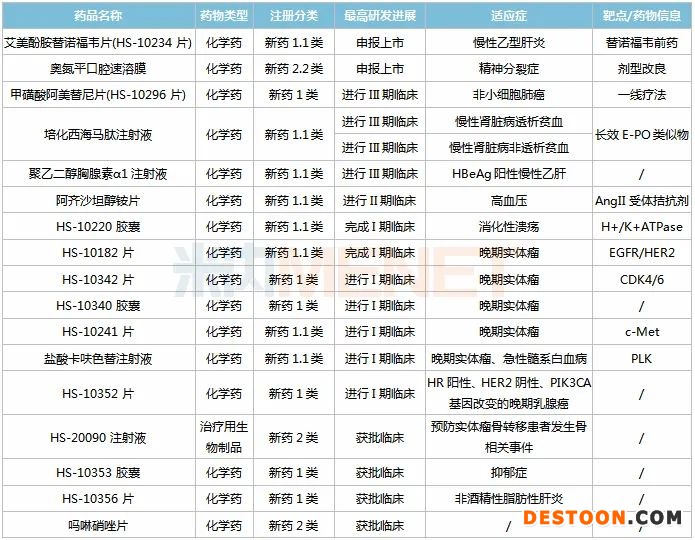 在抗腫瘤領(lǐng)域,HS-10296片(EGFR-TKI抑制劑)針對(duì)EGFR-T790M突變的非小細(xì)胞肺癌適應(yīng)癥已獲批上市,EGFR突變的非小細(xì)胞肺炎(一線療法)適應(yīng)癥正在進(jìn)行III期臨床,其他適應(yīng)癥也陸續(xù)申報(bào)臨床;HS-10241片(c-Met抑制劑)、HS-10342片(CDK4/6抑制劑)、鹽酸卡呋色替注射液(PLK抑制劑)等用于實(shí)體瘤的1類新藥均在開展I期臨床。