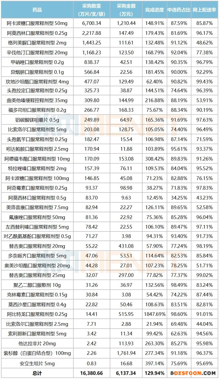 從采購數(shù)量來看,32個(gè)藥品的36個(gè)品規(guī)在全省12個(gè)聯(lián)盟地區(qū)采購總數(shù)量為16380.66萬片/支/袋;按藥品統(tǒng)計(jì),最高為阿卡波糖50mg的6700.34萬粒,最低為安立生坦5mg的0.83萬片。阿卡波糖在江西中標(biāo)的企業(yè)為拜耳,安立生坦中標(biāo)企業(yè)為華海藥業(yè)。