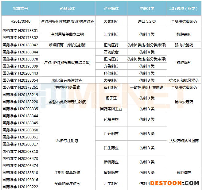 此外,上海禾豐制藥的硫酸鎂注射液、海南普利制藥的注射用比伐蘆定、江蘇盈科生物的丙泊酚中/長鏈脂肪乳注射液、江蘇萬高藥業(yè)的左乙拉西坦注射液、江蘇杜瑞制藥的注射用甲磺酸萘莫司他上市申請已進入行政審批階段,有望在近日獲批并視同過評。