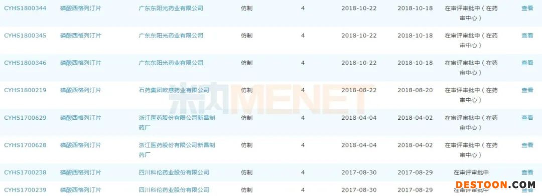 10月10日訊 近日,CDE官網(wǎng)顯示,山東朗諾制藥的磷酸西格列汀片仿制4類上市申請(qǐng)獲得受理。米內(nèi)網(wǎng)數(shù)據(jù)顯示,2019年中國(guó)公立醫(yī)療機(jī)構(gòu)終端磷酸西格列汀片銷售額超過(guò)9億元,生產(chǎn)企業(yè)僅有默沙東。今年2月,正大天晴藥業(yè)以首仿獲批;8月,廣東東陽(yáng)光藥業(yè)成為第二家獲批的仿制藥企業(yè)。截至目前,該產(chǎn)品已有揚(yáng)子江藥業(yè)集團(tuán)廣州海瑞藥業(yè)、辰欣藥業(yè)、石藥集團(tuán)歐意藥業(yè)等10家企業(yè)以仿制4類提交上市申請(qǐng)?jiān)趯徳u(píng)審批中。