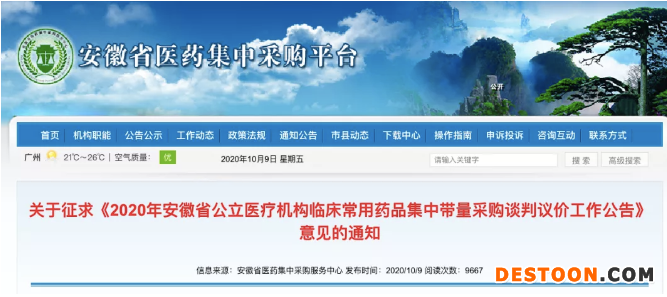 10月9日,安徽省醫(yī)藥集中采購平臺發(fā)布通知關(guān)征求《2020年安徽省公立醫(yī)療機(jī)構(gòu)臨床常用藥品集中帶量采購談判議價(jià)工作公告》的意見。