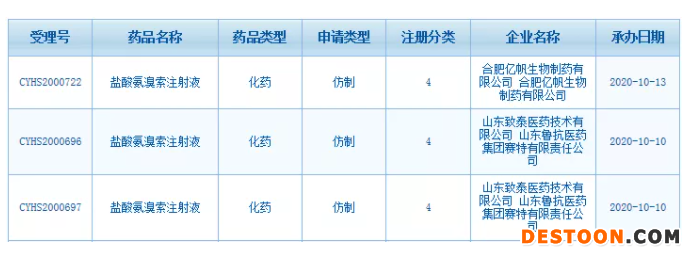 10月14日訊 日前,CDE官網(wǎng)顯示,合肥億帆生物制藥、山東致泰醫(yī)藥|山東魯抗醫(yī)藥的鹽酸氨溴索注射液仿制4類上市申請獲得受理。米內(nèi)網(wǎng)數(shù)據(jù)顯示,2019年中國公立醫(yī)療機構(gòu)終端氨溴索注射劑銷售額近60億元。截至目前,擁有鹽酸氨溴索注射液的國產(chǎn)批文廠家有山東羅欣藥業(yè)、國藥集團國瑞藥業(yè)、石藥集團歐意藥業(yè)、石家莊四藥等40家企業(yè)。此外,還有揚子江藥業(yè)、黑龍江珍寶島藥業(yè)、北京四環(huán)制藥等超過20家企業(yè)提交上市申請,目前在審評審批中。