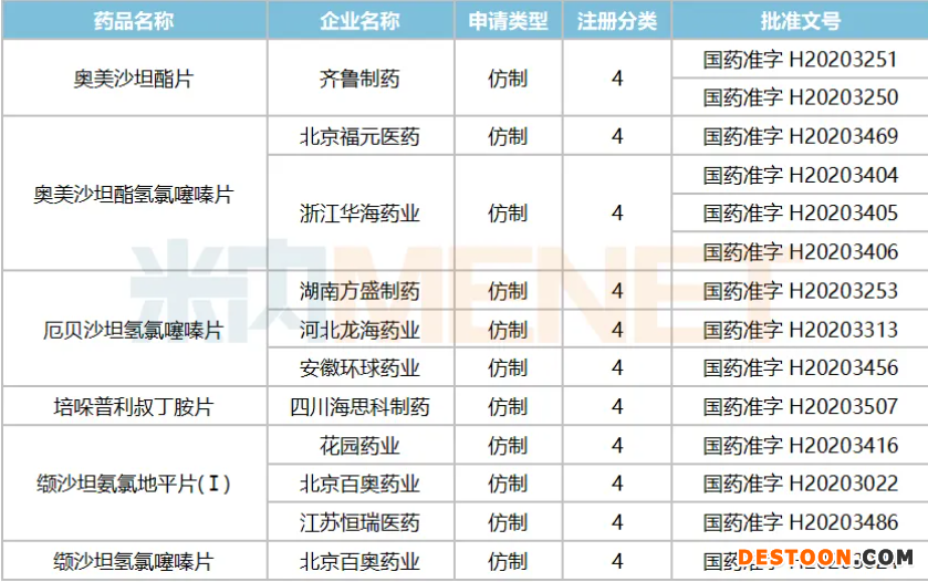 米內(nèi)網(wǎng)數(shù)據(jù)顯示,2020年至今獲批上市的作用于腎素-血管緊張素系統(tǒng)的藥物有11個(按產(chǎn)品名+企業(yè)統(tǒng)計),其中奧美沙坦酯氫氯噻嗪片、厄貝沙坦氫氯噻嗪片、纈沙坦氨氯地平片(Ⅰ)、纈沙坦氫氯噻嗪片均屬于血管緊張素II拮抗劑(復(fù)方),涉及華海、方盛、百奧藥業(yè)、恒瑞醫(yī)藥等多家國內(nèi)明星藥企。