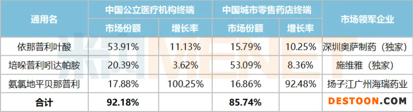氨氯地平貝那普利目前獲批的國內(nèi)藥企有揚子江以及成都地奧制藥集團(tuán),兩家企業(yè)的產(chǎn)品劑量不一樣,在中國公立醫(yī)療機(jī)構(gòu)終端揚子江稱霸,在中國城市零售藥店終端則由成都地奧制藥集團(tuán)領(lǐng)軍,但由于醫(yī)院終端銷售體量較大,整體而言揚子江仍處于領(lǐng)軍地位。