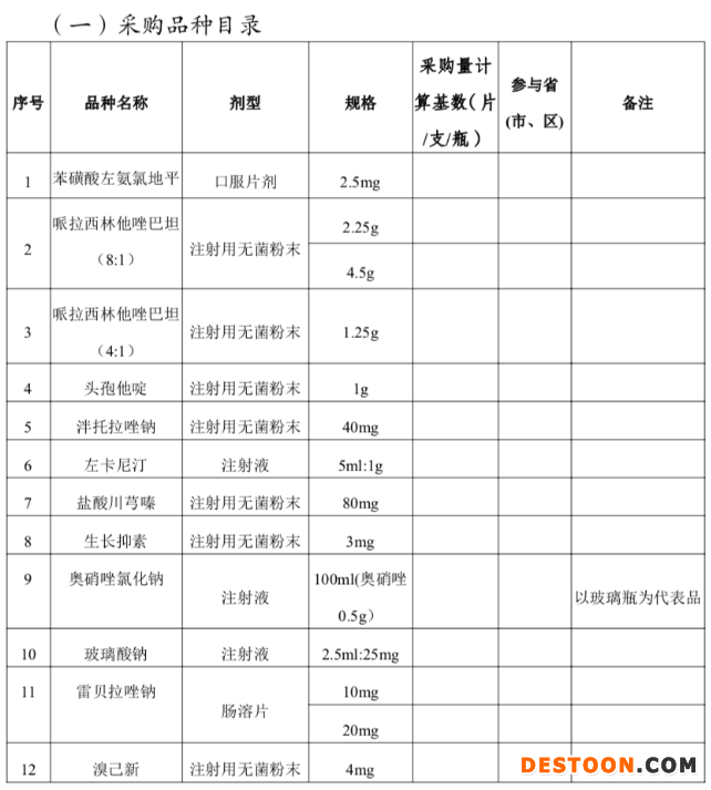 而哌拉西林鈉他唑巴坦(8:1)、哌拉西林鈉他唑巴坦(4:1)、 頭孢他啶、鹽酸川芎嗪、奧硝唑氯化鈉、美洛西林、 頭孢噻肟、丙戊酸鈉、替加環(huán)素約定采購(gòu)量計(jì)算基數(shù),以 2019 年1月1日至2019年12月31日醫(yī)療機(jī)構(gòu)上報(bào)采購(gòu)需求量的60% 累加確定。