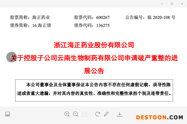 10月13日,海正藥業(yè)發(fā)布《關(guān)于控股子公司云南生物制藥有限公司申請破產(chǎn)重整的進(jìn)展公告》。