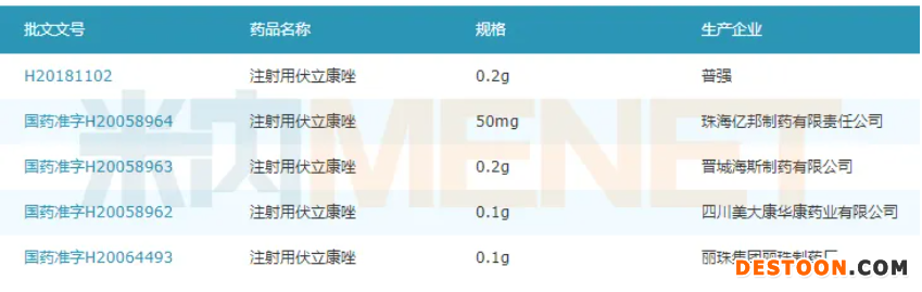 目前獲得注射用伏立康唑生產(chǎn)批文的企業(yè)除了普強(qiáng)(輝瑞旗下公司),還有珠海億邦制藥、晉城海斯制藥、四川美大康華康藥業(yè)以及麗珠集團(tuán)麗珠制藥廠,目前暫無(wú)企業(yè)過(guò)評(píng)。