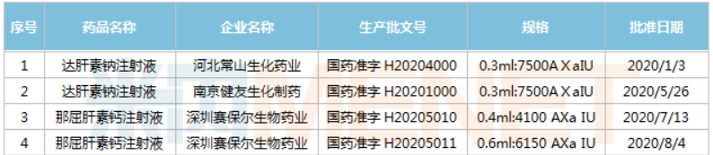 2020年1~9月NMPA頒發(fā)的低分子肝素注射液批文