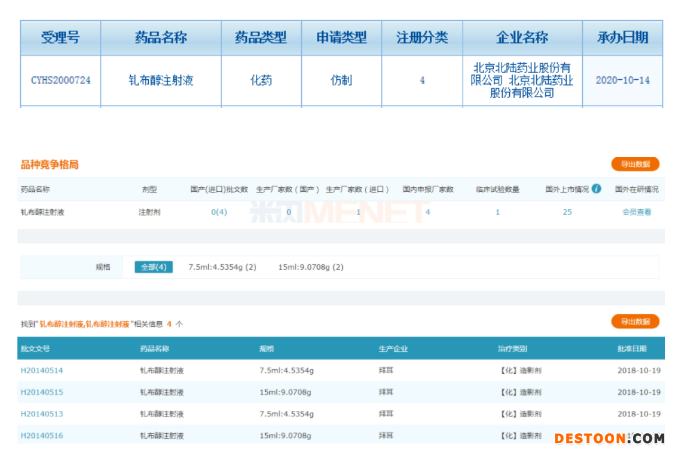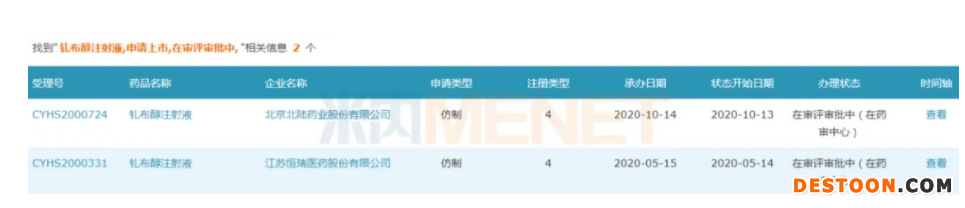 截至目前,釓布醇注射液有北京北陸藥業(yè)和江蘇恒瑞醫(yī)藥以仿制4類提交上市申請,在審評審批中(在藥審中心),獲批后將視同通過一致性評價。