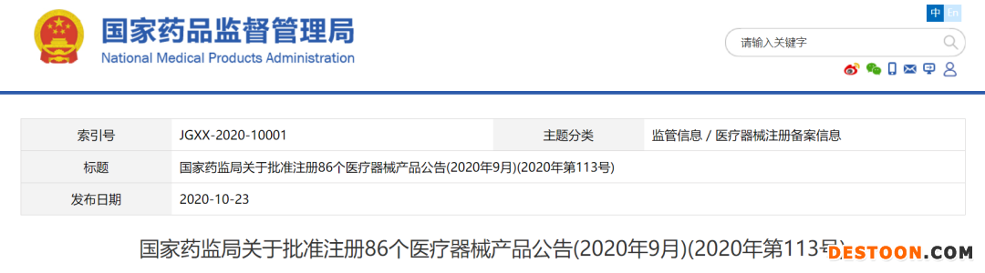 10月27日訊 10月23日,國家藥監(jiān)局發(fā)布《國家藥監(jiān)局關(guān)于批準(zhǔn)注冊86個醫(yī)療器械產(chǎn)品公告(2020年9月)(2020年第113號)》。